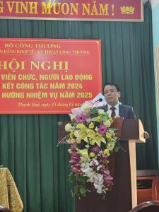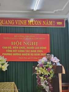 Phát biểu tại Hội nghị, Đ/c Bùi Ngọc Quyết, Hiệu trưởng Nhà trường đánh giá cao những ý kiến trao đổi, góp ý của các cán bộ, viên chức, người lao động đối với các mặt hoạt động của Nhà trường; đồng thời nhấn mạnh nhiệm vụ quan trọng Nhà trường cần triển khai thực hiện trong năm 2025, cụ thể: công tác tuyển sinh, công tác đào tạo, nghiên cứu khoa học, xây dựng đội ngũ cán bộ viên chức, quản lý tài chính, xây dựng cơ sở vật chất, trang thiết bị phục vụ đào tạo. Nhân dịp năm mới 2025, Đ/c Bùi Ngọc Quyết gửi lời chúc sức khỏe, thành công đến toàn thể đại biểu và các cán bộ, viên chức, người lao động trong Nhà trường. Hội nghị kết thúc trong không khí đoàn kết, thống nhất và quyết tâm cao của tập thể CBVC Nhà trường đưa Trường Cao đẳng Kinh tế- Kỹ thuật Công Thương tiếp tục những bước phát triển vững mạnh trong thời gian tới